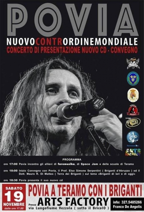 A Teramo, il 19 novembre 2016, il famoso cantautore Giuseppe Povia, con le Associazioni Briganti d'Abruzzo ed i Comitati delle Due Sicilie Abruzzo, presso Arts Factory, incontrerà alle ore 17.00, gli allievi di Faremusika e di Space Jam; alle ore 18.00, terrà una conferenza con il Prof. Elso Simone Serpentini ed il Dottor Mauro Di Matteo (Gal Terra dei Briganti) sul tema Briganti di ieri e di oggi; alle ore 18.30 terrà il concerto acustico di presentazione del nuovo Album NUOVOCONTRORDINEMONDIALE; il tutto coordinato dal consigliere nazionale dei Comitati delle Due Sicilie Franco De Angelis