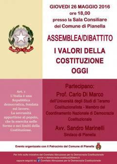 Giovedì 26 maggio 2016, alle ore 18:00, presso la Sala Consiliare del Comune di Pianella si terrà un'Assemblea pubblica/Dibattito per illustrare l'attualità dei valori espressi dalla nostra Costituzione.