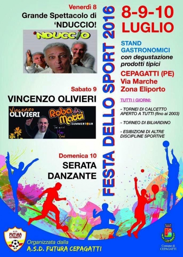 Si tratta della "Festa dello Sport" l'evento che caratterizzerà il comune dall'8 luglio al 10 luglio ed è stato organizzato dall'A.S.D. Futura Cepagatti con il patrocinio del Comune di Cepagatti. Tutti i giorni ci saranno tornei di calcetto aperti a tutti (nati fino al 2003), non mancheranno tornei di biliardino ed esibizioni di altre discipline sportive