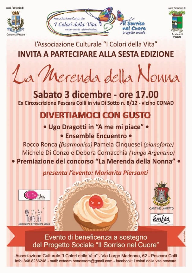 Domani, Sabato 3 Dicembre 2016 alle ore 17 presso la ex circoscrizione di Pescara Colli, in via Di Sotto 8/12, l’Associazione Culturale I Colori della Vita presenta la sesta edizione de “La merenda della nonna”, un simpatico concorso culinario pensato per sensibilizzare grandi e piccini, giovani e meno giovani alla riscoperta e alla condivisione delle tradizioni culinarie e delle sane abitudini alimentari.