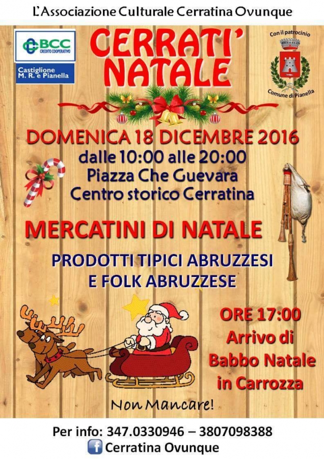 Grazie all'Associazione Culturale Cerratina Ovunque e al Patrocinio del Comune di Pianella domenica 18 dicembre si respirerà atmosfera natalizia anche presso il centro storico di Cerratina e precisamente in piazza Che Guevara dove dalle 10 alle 20 ci sarà una vera festa legata al territorio.
