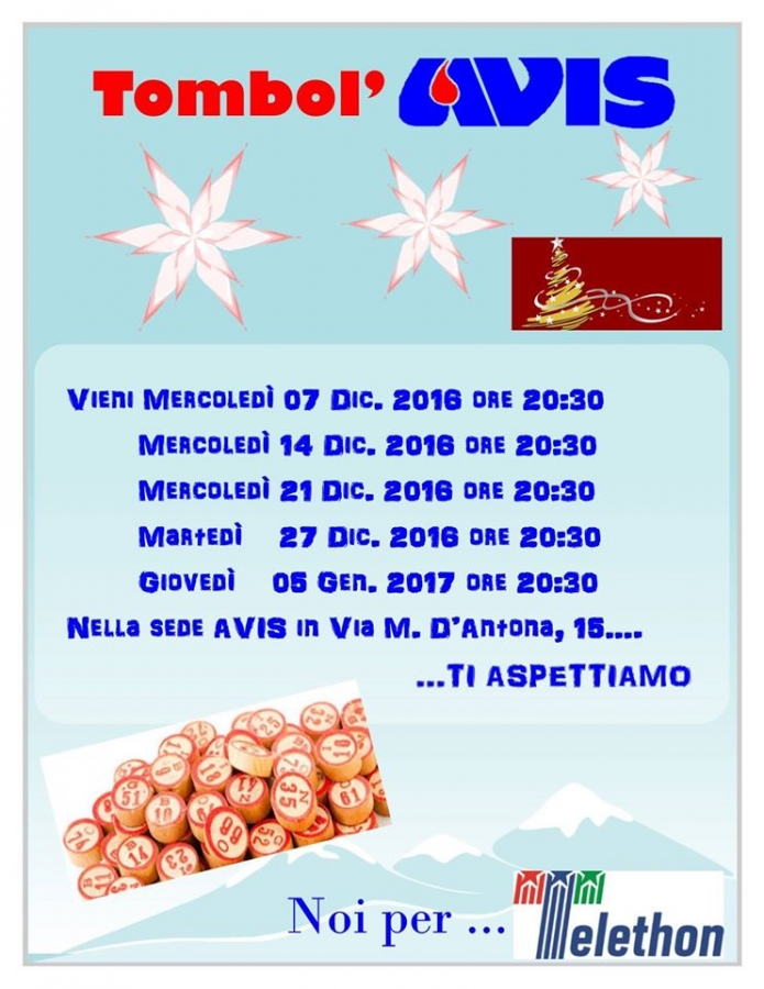 Successivamente sono previste altre tre tombolate per mercoledì 21 dicembre, martedì 27 dicembre e giovedì 5 gennaio, alle ore 20.30.