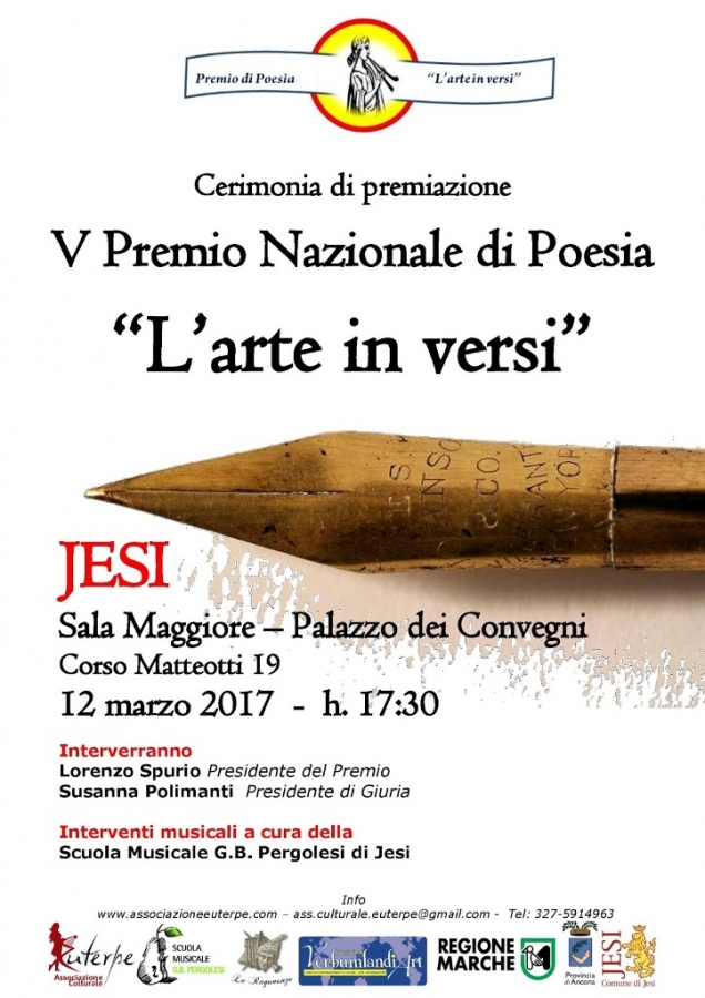 A causa dello sciame sismico che ha interessato l’intera Regione, la cerimonia di premiazione della V edizione del Premio Nazionale di Poesia “L’arte in versi”, ideato e presieduto dal critico letterario e poeta jesino Lorenzo Spurio, si terrà domenica 12 marzo al Palazzo dei Convegni di Jesi a partire dalle 17:30; per ovvie ragioni è stato posticipato.