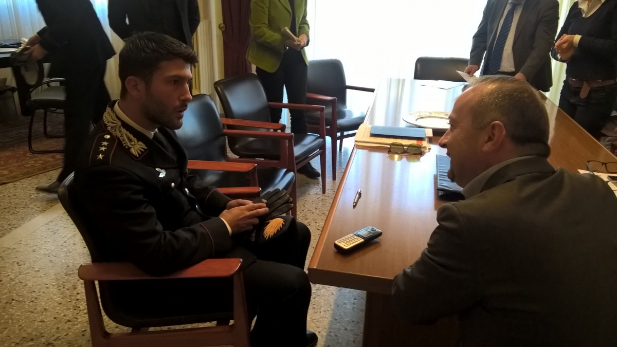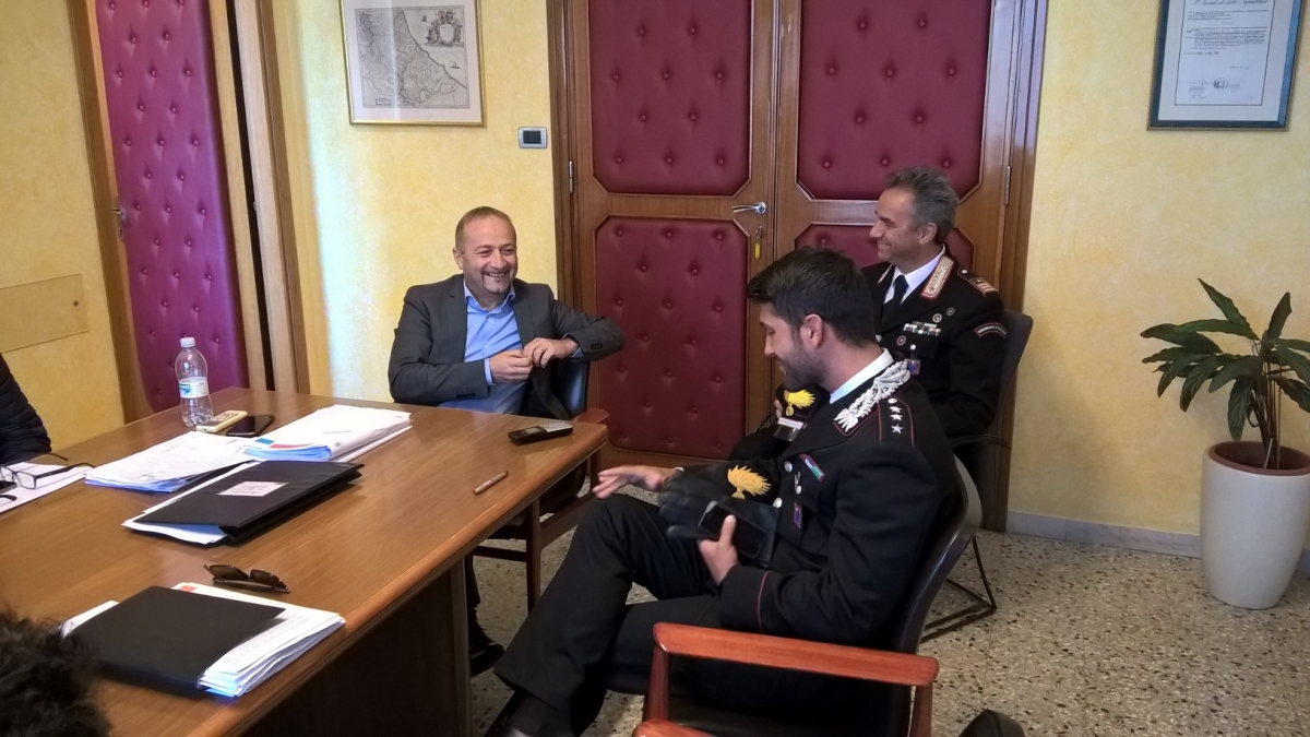 Spoltore - Il capitano Antonio Di Mauro, da qualche settimana comandante della Compagnia carabinieri di Pescara, ha incontrato il sindaco Luciano Di Lorito. Ad accompagnarlo il luogotenente Silvio Tomassini, comandante della stazione di Spoltore. Una visita ufficiale per presentarsi e discutere insieme della realtà sociale ed economica dell'area metropolitana. Il militare, trent'anni e originario di Napoli, ha parlato con il primo cittadino del funzionamento della macchina amministrativa, e ha ricordato anche la sua esperienza con i Comuni degli ultimi tre anni, nei quali ha diretto la Compagnia carabinieri di Roccella Jonica in provincia di Reggio Calabria.