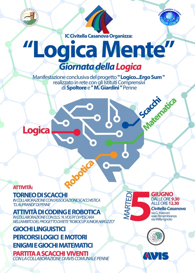 Martedì 5 giugno a conclusione del progetto in rete  Logico…Ergo Sum, circa 500 alunni delle scuole primarie e medie dell'I.C. Civitella insieme ad alcune classi in rappresentanza dell'Istituto Comprensivo "Dante Alighieri" di Spoltore e dell'Istituto Comprensivo di Penne "Mario Giardini" si metteranno alla prova in tornei di scacchi, attività di robotica, giochi linguistici e matematici, percorsi logici ed esperienze pluridisciplinari per ogni età, animando allegramente le vie di Civitella Casanova. La manifestazione si concluderà con la partita degli scacchi viventi realizzata grazie alla collaborazione dell'Avis comunale Penne e in cui si sfideranno gli alunni dei tre istituti che si sono distinti nelle fasi provinciali, regionali e nazionali dei campionati studenteschi di scacchi. Parteciperanno alla manifestazione  il prof. Carlo Petracca che ha seguito i dipartimenti di italiano e scienze nella ricerca-azione prevista dal progetto "Logico...Ergo Sum", i docenti dell'I.I.S. "Alessandro Volta" di Pescara che cureranno le attività di robotica nell'ambito del progetto di rete "Robocup Junior Abruzzo" e gli istruttori dell'Associazione scacchistica "Diego Aliprandi" di Penne.