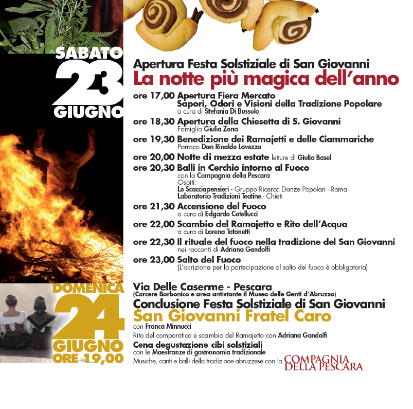 Sabato 23 e domenica 24 la Festa Solstiziale di San Giovanni: dalle ore 17.00 l'apertura della Fiera Mercato nel centro storico di Spoltore per una notte tra letture, balli in cerchio intorno al fuoco con la Compagnia della Pescara e il salto del fuoco alle ore 23 (per partecipare al salto del fuoco è obbligatoria l'iscrizione). La festa solstiziale si concluderà il giorno dopo a Pescara, alle ore 19.00, nell'area antistante il Museo delle Genti d'Abruzzo in via delle Caserme: qui Franca Minnucci interpreta San Giovanni Fratel Caro. Completano il programma il rito del companatico, lo scambio del Ramajetto con Adriana Gandolfi, una cena di degustazione di cibi solstiziali, musiche canti e balli della tradizione abruzzese.