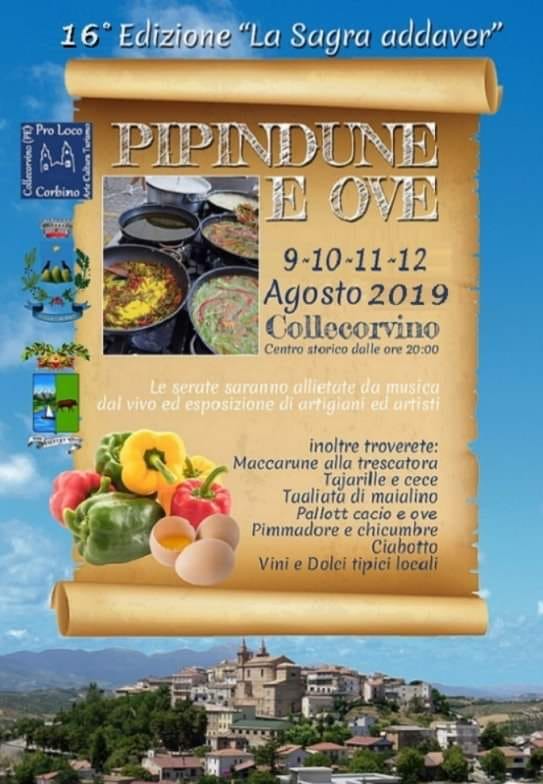 “La Sagra Plastic Free” è questo lo slogan scelto per la 16^ edizione della Sagra Pipindune e Ove, in programma dal 9 al 12 agosto, che si svolgerà all’interno del centro storico del Comune di Collecorvino con l’intento di valorizzare e promuovere i prodotti tipici a km 0, far conoscere a tutti l’anima storica di una comunità e dei luoghi che un tempo ospitavano la maggior parte della popolazione, dei negozi e delle botteghe artigiane.