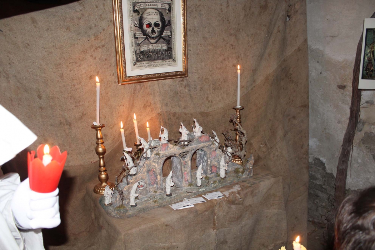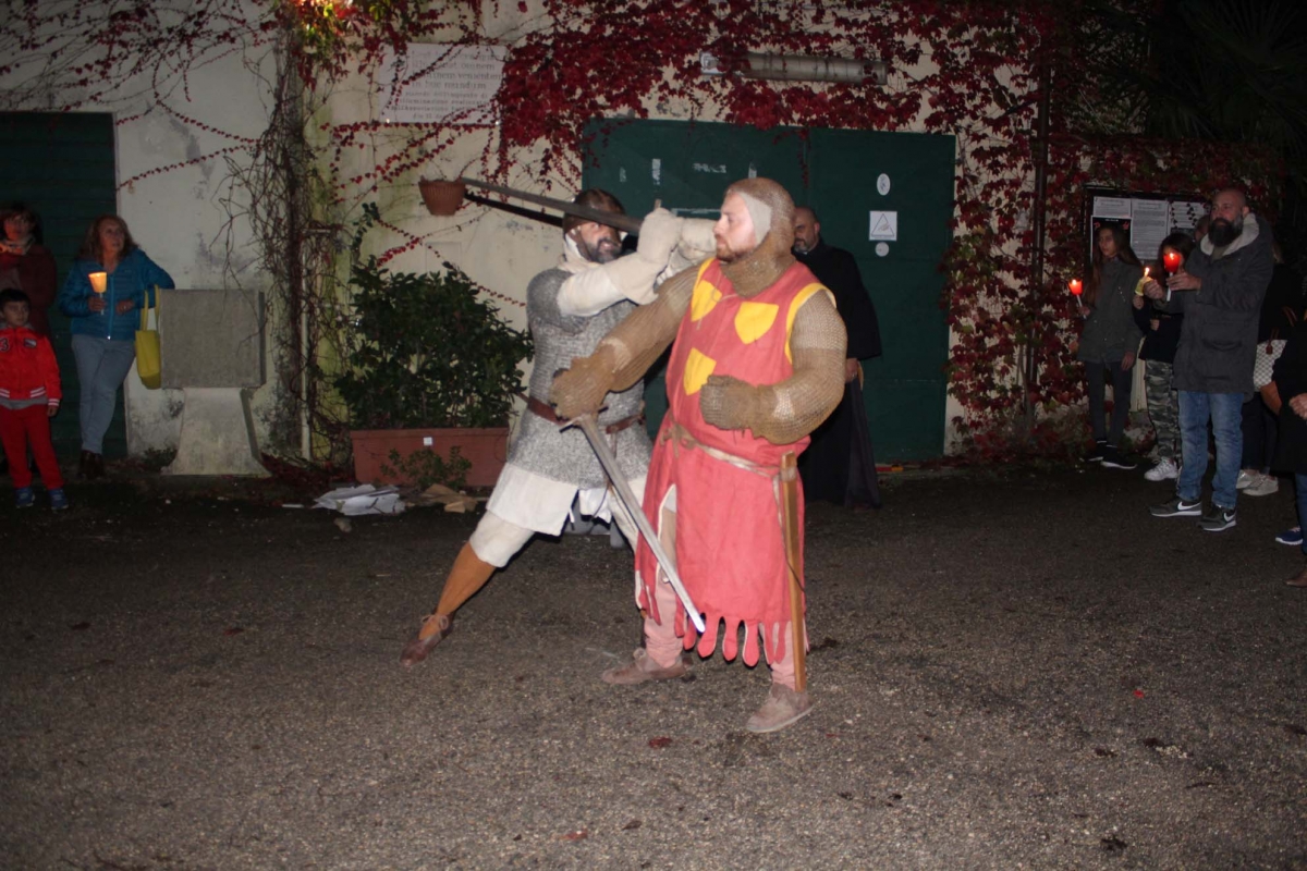 Oltre duecento persone hanno partecipato alla rievocazione storica de ‘La Tavola dei Morti’, la manifestazione promossa per il sesto anno consecutivo dall’Associazione Fontevecchia, con il patrocinio della Presidenza del Consiglio della Regione Abruzzo e del Comune di Spoltore, nella notte tra il primo e 2 novembre lungo i vicoli del Borgo Case Troiano. Ad animare la tradizione sono state le figure allegoriche della Processione dei Frati Morti, de Lu’ Mazzamurille’, il Pulcinella abruzzese, trait d’union tra il mondo dei vivi e quello dei morti, i Cavalieri erranti, le anime del Purgatorio, le anime pezzentelle, e le Zampogne, per riscoprire alla fine del percorso, attraverso la narrazione teatralizzata, il rito tutto abruzzese del lasciare le tavole imbandite in quella notte speciale per accogliere il ritorno e il transito delle anime dei cari defunti. Un percorso negli aneddoti e nelle storie raccontate dai nostri nonni che mira quindi alla riscoperta dei riti legati alla commemorazione dei defunti tipicamente italiani e che nulla hanno a che vedere con Halloween. “Con la ‘Tavola dei Morti’ – ha ricordato il Presidente dell’Associazione Fontevecchia Troiano aprendo la manifestazione alla presenza dell’assessore alla Cultura del Comune di Spoltore Roberta Rullo -, celebrazione che non ha nulla a che vedere con le feste anglosassoni, vogliamo raccontare ai più giovani e riportare alla luce una tradizione importante per la nostra storia, appunto il dovere di onorare nella maniera più giusta, rispettosa e opportuna quelle persone che hanno fatto parte della nostra vita e che in quella notte, vuole la narrazione, tornano nelle loro case per un breve attimo, a salutare i propri cari. Tradizione del centro-sud vuole che in quella notte le famiglie lascino la tavola imbandita come nei giorni di festa, con le migliori cibarie del mondo contadino, maccheroni al sugo, pollo al forno con le patate e la pizza dolce, proprio per dare il benvenuto ai propri cari”. L’evento, completamente gratuito, ha preso il via alle 19, dinanzi alla sede della Motorizzazione civile, con il ‘Racconto dei Luoghi’, e, con la sola luce delle candele al suono delle zampogne del maestro Matteo Di Marco, è partito il cammino verso il Borgo Case Troiano, seguendo un percorso delimitato dai lumini, e con alcune pause, ciascuna delle quali è stata caratterizzata da un racconto su vicende e personaggi che hanno caratterizzato il Borgo stesso. Lungo la stradina del borgo, alla ‘vutate de lo lope’, si è incrociata la Processione dei Frati Morti accompagnati dai Cavalieri erranti di Marco De Marinis e la Compagnia di Rievocazione medievale, con la storia dei ‘tre vivi e tre morti’, che ha accompagnato i presenti sino all’oliveto dove ad aspettare il pubblico c’era ‘Lu’ Mazzamurille’, spiritello dispettoso abituato a prendersi gioco dei vivi, e la ‘tomba del Cavaliere’. All’ingresso del Borgo Case Troiano è stato allestito l’Altare devozionale per le anime del purgatorio, con la rappresentazione della Processione dei Frati ricostruita dal Maestro presepista di Napoli Aldo Vucai, e quindi la tappa nell’aia con il combattimento mortale tra i Cavalieri erranti. Infine la visita delle abitazioni con le tavole imbandite per la cena accompagnati dal ‘Cantore di Ognissanti’ e dal suono delle zampogne. All’esterno di ogni abitazione l’illustrazione dei simboli, come il sacchetto di grano, la scopa rovesciata, la bacinella, il bastone, e, ogni volta, la scoperta delle ragioni di quelle presenze che affondano le radici nella tradizione abruzzese. Durante la serata è stato possibile rendere omaggio alla Chiesa della Santissima Trinità, situata nel borgo, regolarmente aperta: l’ingresso è stato caratterizzato dalla presenza di un ‘Pulcinella abruzzese’, quale trait d’union tra il mondo dei vivi e quello dei morti, e, secondo le antiche credenze, il primo che è entrato ha liberato un’anima del Purgatorio. Al termine dell’evento, rigorosamente gratuito, a tutti i partecipanti è stato offerto il ‘cibo penitenziale’, “un cibo povero contrapposto a quello ricco delle tavole, proprio perché la tavola imbandita doveva essere riservata ai defunti”, ha ricordato il Presidente Troiano. Dunque anche il cibo rituale è stato rigorosamente rispettoso della tradizione, costituito da ‘il grano dei morti’, ossia grano saraceno bollito con noci, melograno e mosto cotto, fave lesse, ceci abbruscati, zucca e patane e vino rosso, un’occasione dunque per riscoprire una tradizione diffusa in tutto il meridione sino agli anni ’60 e che purtroppo si è andata perdendo. Sabato 9 novembre, per il terzo anno consecutivo, l’evento verrà replicato a Napoli con la ‘Processione dei Frati Morti’, evento che aprirà di nuovo il ricco cartellone del lungo Natale partenopeo, dove l’Associazione Fontevecchia sarà affiancata dagli amici dell’Associazione culturale ‘Camminando Insieme’ di Chieti, che conta oltre cento soci, e a Napoli sarà accolta dall’Associazione de ‘I Sedili di Napoli’, con i quali si riporterà alla luce anche la tradizione partenopea de ‘Le Cascettelle dei Morti’.