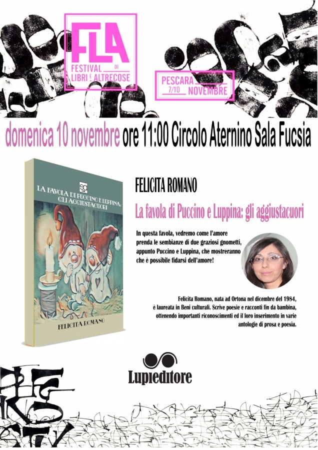 alle ore 11:00 presso il Circolo Aternino - Sala Fucsia a Pescara, con la nuova esperienza letteraria “La favola di Puccino e Luppina: gli aggiustacuori”.