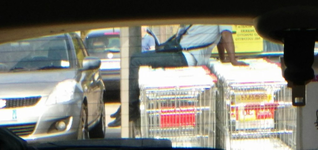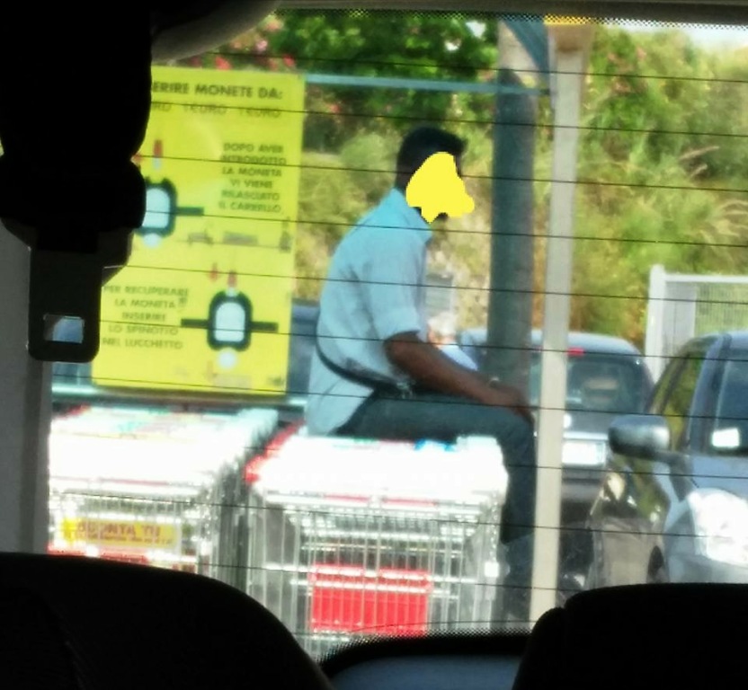 Un uomo siede sui carrelli della spesa, la segnalazione di un cittadino