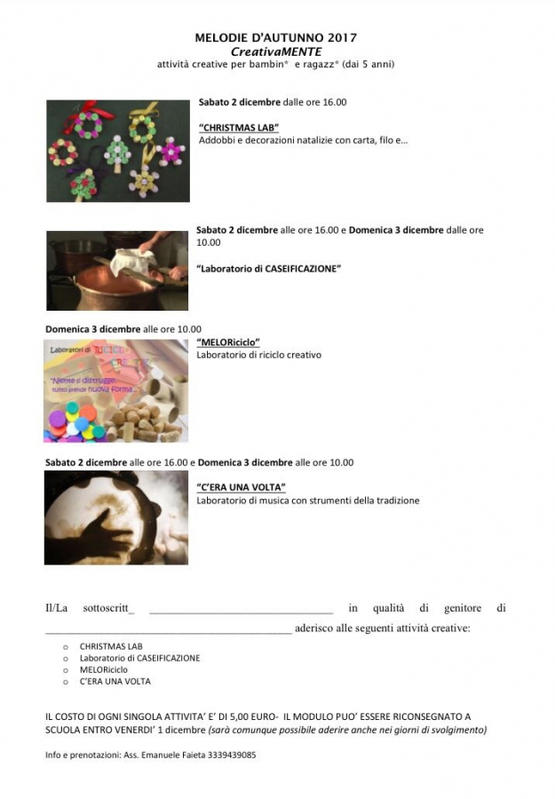 Si parte dal sabato pomeriggio fino alla domenica sera, con un ricco mercatino dell’artigianato, le botteghe del gusto “Sapori d’Autunno”, con punti degustativi di prodotti a “chilometro zero”e molte altre prelibatezze – come polenta, salsicce, olio nuovo e vin brulè - che allieteranno i palati dei visitatori, passando per momenti dedicati ai più piccoli con laboratori creativi, spettacoli di magia e itineranti a cura dei LUCU THEA e de LA COMPAGNIA DELL'ILEX, che si ripeteranno più volte nel corso delle giornate, concludendo le due serate con le melodie della tradizione di “LI BBIFOLK” ,“LA STRUCCLATORE FOLK” e “I RAGAZZI DEL SALTARELLO”.