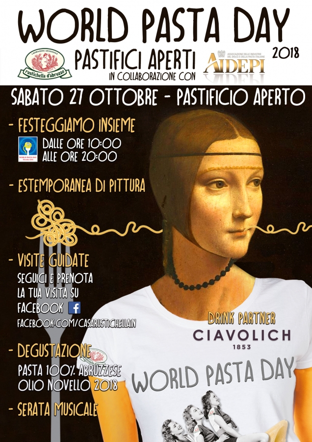 Dopo il successo della prima edizione torna il World Pasta Day di Rustichella d’Abruzzo. In collaborazione con l’associazione AIDEPI (Associazione delle Industrie del Dolce e della Pasta italiane), l’azienda festeggia la vera “padrona di casa” con l’iniziativa World Pasta Day – Pastifici Aperti 2018. L’appuntamento è per sabato 27 ottobre a partire dalle ore 10.00 fino alle 20.00, per una giornata all’insegna della convivialità con musica, degustazioni e visite guidate all’interno dello stabilimento produttivo in Contrada Casale a Moscufo (PE). L’evento, aperto al pubblico, è totalmente gratuito. È prevista solo una prenotazione online tramite la pagina Facebook del sito www.casarustichellain.com. Per l’occasione sarà possibile degustare alcune delle nostre referenze tra cui la linea PrimoGrano, prodotto di filiera realizzato con il 100% di grano duro abruzzese. Ai fornelli lo chef romano Marco Mazzone da sempre ambasciatore della pasta Rustichella in tutta Italia. “Abbiamo voluto replicare un’iniziativa nata quasi per caso lo scorso anno ma che siamo felici di riproporre al pubblico abruzzese e a tutti gli amanti della pasta - ha dichiarato Maria Stefania Peduzzi, titolare RdA e Responsabile del reparto Comunicazione e Marketing del brand abruzzese presente oggi in 70 paesi del mondo. “Attraverso i nostri prodotti amiamo oltrepassare ogni stereotipo e promuovere l’Abruzzo in tutta la sua essenza e bellezza”.