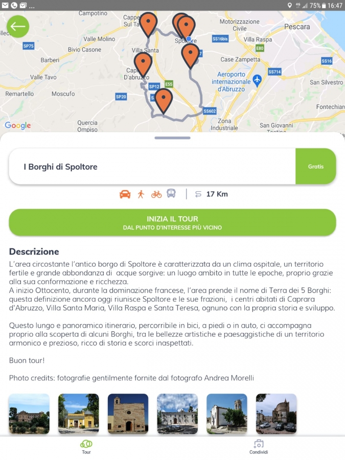 L'app è stata presentata ieri (mercoledì 14 luglio), nell'ambito della serata "Spoltore riparte!" dedicata alle nuove strategie turistiche per la città . La terra dei 5 borghi è uno dei primi itinerari disponibili, con due percorsi dedicati uno al centro storico e l'altro, appunto, ai diversi nuclei urbani che formano il territorio. "CityAROUND è un'ottima soluzione per tutte un'amministrazione locale come la nostra" spiega l'assessore Chiara Trulli "desiderosa di incentivare la promozione del proprio territorio. Accanto alle funzioni dall’applicazione stessa, diventa anche un piattaforma di partenza per altri contenuti e servizi, sempre ovviamente collegati alle attrattive turistiche".