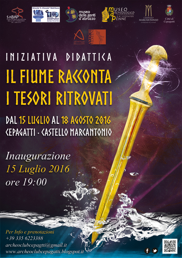 In questa edizione ci sarà un iniziativa didattica dal titolo “il fiume racconta… i tesori ritrovati” con un esposizione al piano terra della Torre Alex del Castello Marcantonio, di reperti locali dal neolitico al periodo italico preromano, in particolare spade rituali provenienti dalle rive dei fiumi Pescara e Nora, oltre ad asce, punte di lancia del II millennio a.C., per tale iniziativa è stato girato un video dal titolo “Spade sacre dal fiume, un antichissimo dono rituale” in cui è stato ricostruito a cura della sezione di Archeologia sperimentale della nostra sezione Archeoclub, l’offerta di una spada al fiume come doveva essere in uso nel II millennio a.C., nel video girato con la consulenza scientifica e il commento del Dott. Andrea R. Staffa del SABAP dell’Abruzzo, oltre ad Dott. Vincenzo D’Ercole della direzione Generale per le Antichità di Roma, compare uno dei protagonisti del ritrovamento delle spade esposte il sig. Michele Cantò di Cepagatti che trovò due spade negli anni 60 nei pressi della confluenza del fiume Pescara e Nora.