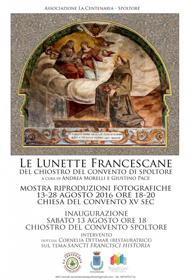 Sabato 13 agosto, alle ore 18.00, nel Chiostro del Convento Cinquecentesco di Spoltore, sarà inaugurata la mostra “Le Lunette Francescane”, che resterà aperta al pubblico fino al 28 agosto 2016. L’iniziativa è inserita nel cartellone della XVIII edizione de ‘I Giorni della Musica, dell’arte e della memoria’, manifestazione culturale organizzata dall’Associazione ‘La Centenaria’ con il patrocinio del Comune.