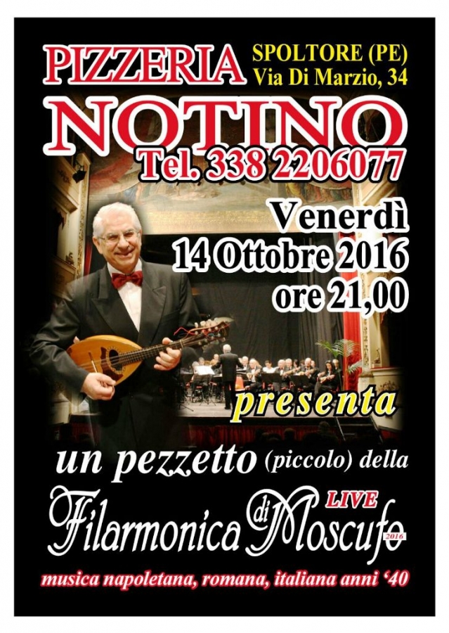 L'ultracentenaria Filarmonica di Moscufo si esibirà questa sera, venerdì 14 ottobre, presso la pizzeria Notino di Spoltore alle ore 21 dove presenterà un "pezzetto" del gruppo in un live.