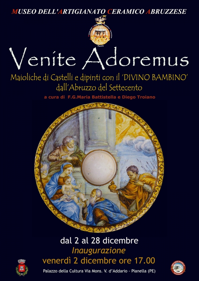 Venerdì 2 dicembre alle ore 17.00 nel Museo dell'Artigianato Ceramico Abruzzese in Via Mons. d'Addario a Pianella si inaugurerà la mostra "Venite Adoremus: maioliche di Castelli e dipinti con il Divino Bambino dall'Abruzzo del Settecento", curata da Franco G. Maria Battistella e da Diego Troiano.