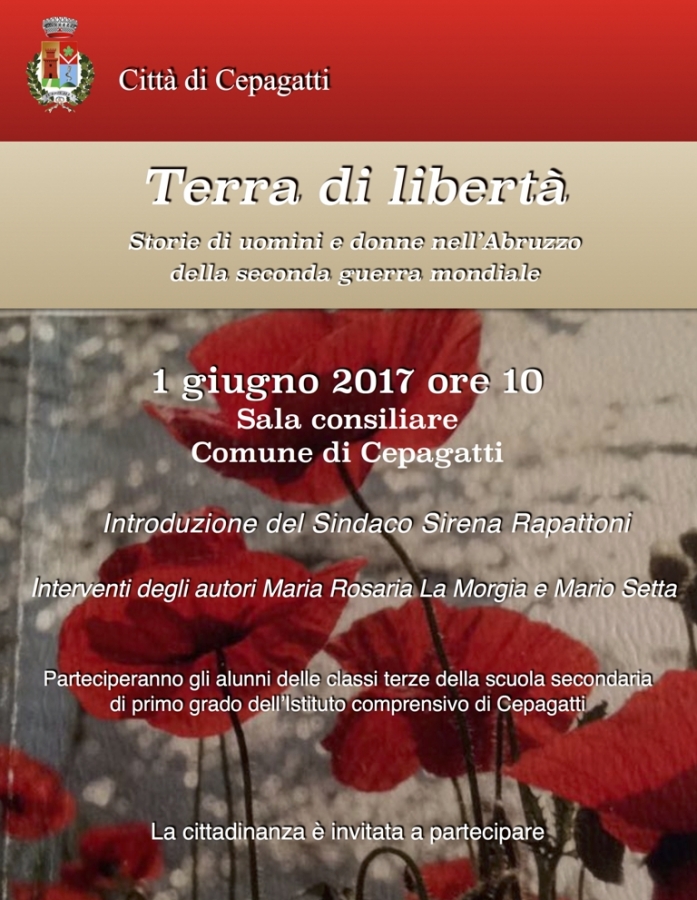 Testimonianze di vita di persone che hanno segnato la storia dell'Abruzzo e del Paese, accogliendo i prigionieri in fuga dai campi di concentramento. Si ritrovano nelle pagine di "Terra di libertà . Storie di uomini e donne nell'Abruzzo della seconda guerra mondiale", il libro scritto da Maria Rosaria La Morgia e Mario Setta, che sarà presentato giovedì 1 giugno, alle ore 10, nella sala consiliare del Comune di Cepagatti, su iniziativa dell'Amministrazione comunale. Parteciperanno gli autori, il sindaco Sirena Rapattoni e gli alunni delle classi terze della scuola secondaria di primo grado dell'Istituto Comprensivo di Cepagatti. "Il libro cerca di presentare storie di uomini e donne che hanno lasciato impronte indelebili sulla terra d'Abruzzo - spiegano gli autori - Terra di libertà perché aspirazione e traguardo di ogni protagonista, in un tempo in cui la libertà era perseguitata, martoriata, assassinata". Attraverso numerose testimonianze, il libro racconta della straordinaria generosità mostrata dalle gente abruzzese nel 1943, al momento dell'Armistizio, quando più di 40mila prigionieri riuscirono a fuggire dai campi di concentramento. I tedeschi ne ripresero circa la metà . Molti si rifugiarono tra la popolazione, dove trovarono persone che li aiutarono a varcare le linee nemiche o a nascondersi.