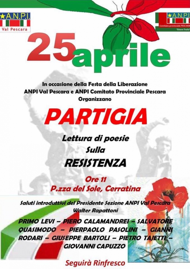 Cerratina - il 25 aprile verrà commemorato attraverso letture di poesie dedicate alla resistenza. Quests l'iniziativa promossa dall'ANPI Val Pescara con la collaborazione dell'ANPI Pescara.