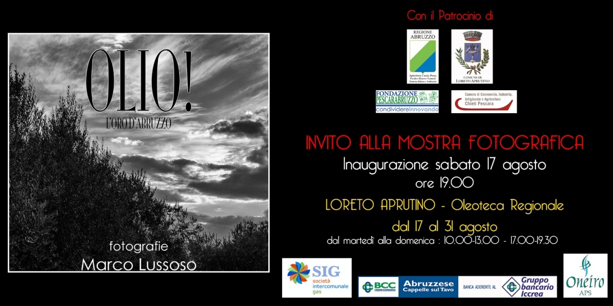La mostra, patrocinata dalla Regione Abruzzo, dal Comune di Loreto Aprutino, dalla Fondazione PescarAbruzzo, CCIAA di Chieti Pescara e con il contributo della BCC Abruzzese di Cappelle Sul Tavo, la SIG e l’associazione Onéiro dà seguito al libro fotografico “L’olio! L’oro d’Abruzzo” presentato nei mesi scorsi da Marco Lussoso che ha immortalato al suo interno scatti di vita quotidiana, rigorosamente in bianco e nero, nel periodo di raccolta dell’ulivo nella nostra regione.