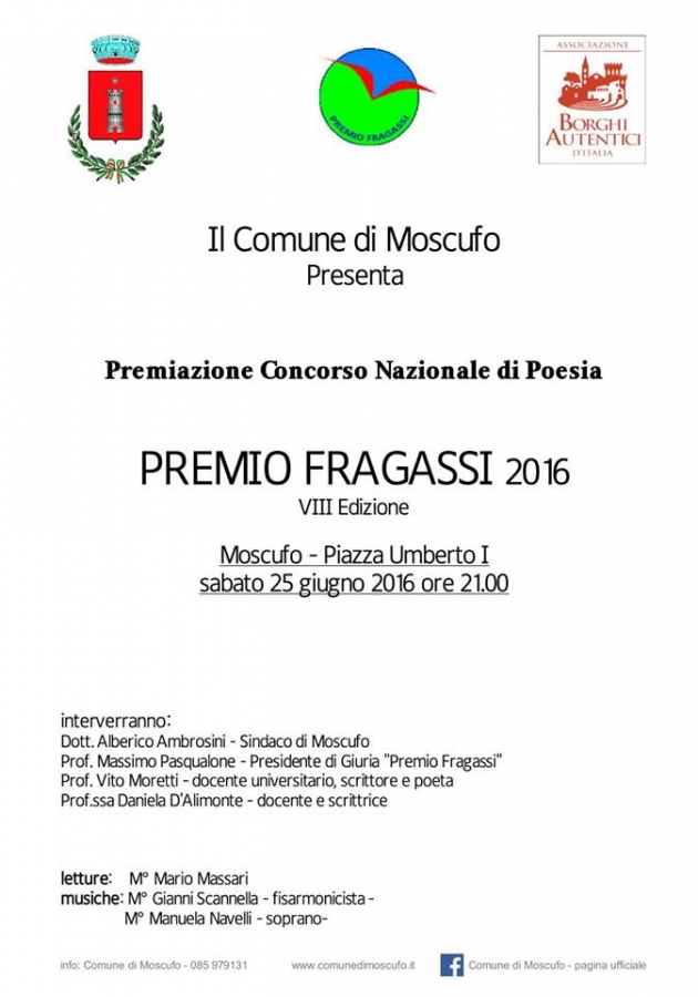 Alle ore 21.00 presso piazza Umberto I, nel cuore del borgo, si terrà la cerimonia di premiazione del Concorso Nazionale di Poesia - “Premio Fragassi 2016”, VIII Edizione; "Oltre i confini" - Poesia è guardare il Mondo con occhi nuovi, questo il tema scelto per quest'anno.