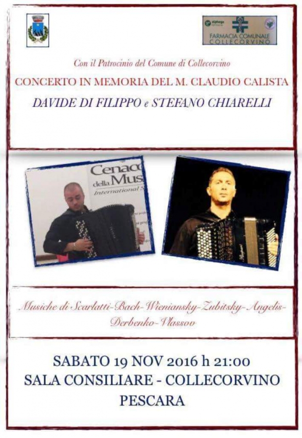 Il concerto si terrà sabato 19 novembre alle 21:00 presso la Sala Consiliare del Comune di Collecorvino: questa sarà la ventiduesima edizione poiché sono 22 gli anni dalla scomparsa del Maestro Claudio Calista.