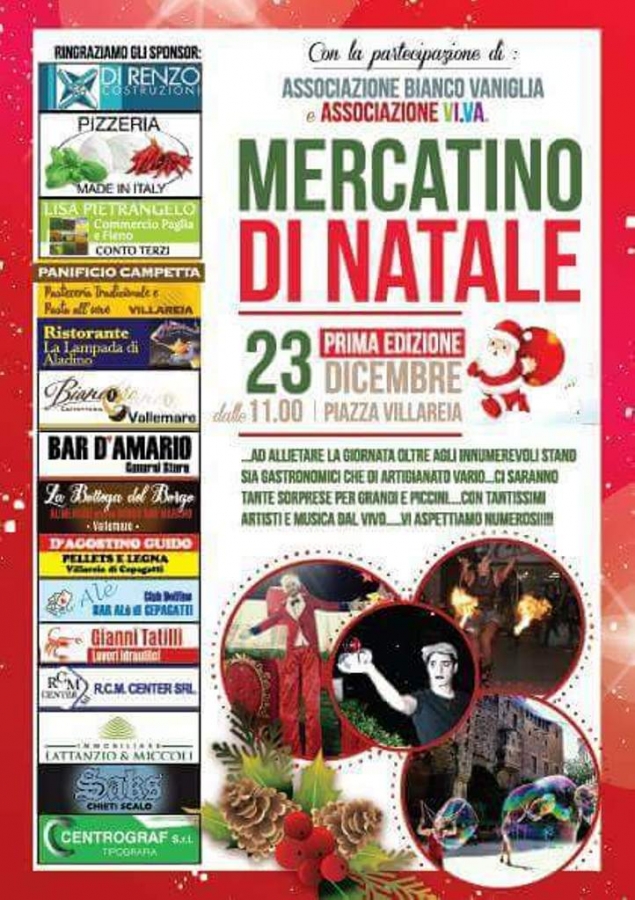 La giornata del 23 dicembre sarà particolarmente ricca di iniziative: dalle 11.00 fino a sera infatti si svolgerà presso la Piazza di Villareia un Mercatino di Natale con stand gastronomici-artigianali, spettacoli di musica folkloristica, giocoleria, carrozza di Babbo Natale e tante altre sorprese per grandi e piccini organizzato dall'Associazioni BiancoVanigia e dall'Associazione ViVa in collaborazione con il Comune di Cepagatti.