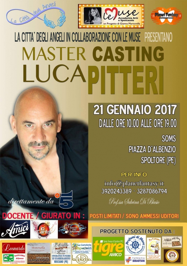 Sabrina Di Blasio di Santa Teresa di Spoltore (PE), cantante affermata sul territorio nazionale facente parte dell’Associazione Culturale “La Città degli Angeli”, in collaborazione con Gianna Martorella dell’Accademia di Arti e Spettacolo “Le Muse” di Piombino, e con l’aiuto di Planetfantasy animazione, organizzano per il 21 Gennaio 2017 un “Master Casting” rivolto a tutte le persone che sono già affermate o vogliono avvicinarsi al magico mondo della musica.