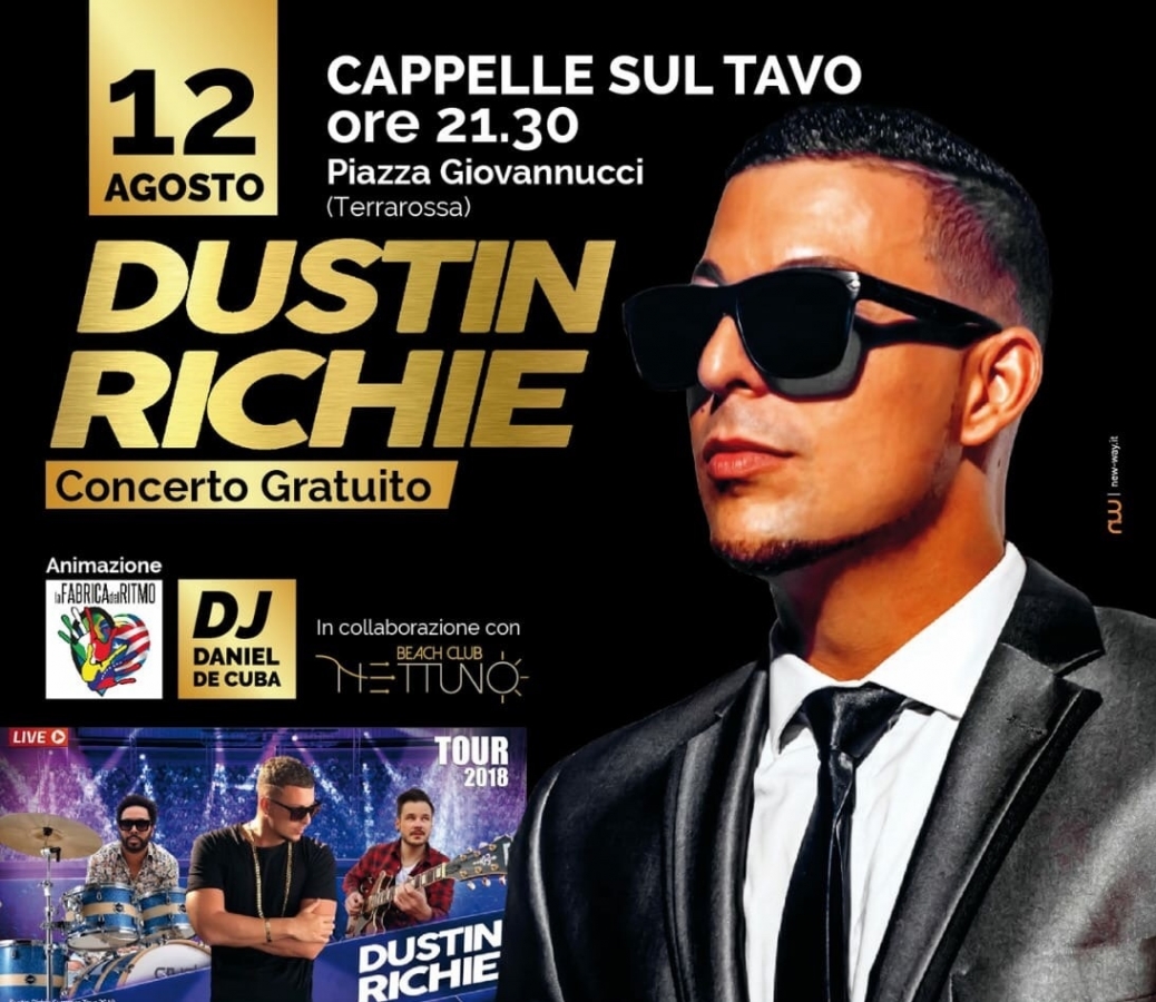 Ad esibirsi in piazza, in località Terrarossa sarà Dustin Richie, cantante , compositore, di origine Cubana, che porterà sul palco tutto il suo repertorio, composto da Bachata, Salsa, Reggaeton, Hip Hop.