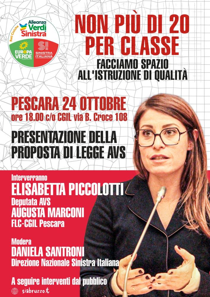 Classi sovraffollate, accorpamenti e chiusure di scuole nelle aree interne e montane: è lo scenario che viviamo anche nelle scuole abruzzesi. Contro l’impoverimento della scuola pubblica, Alleanza Verdi e Sinistra ha lanciato una proposta di legge di iniziativa popolare, “Non più di 20 per classe – Facciamo spazio all’istruzione di qualità”, che sarà presentata a Pescara venerdì 24 ottobre, alle ore 18 nella sala Lama della Cgil, dalla deputata di Avs Elisabetta Piccolotti. Interverrà anche Augusta Marconi, FLC-Cgil Pescara; modera Daniela Santroni, Direzione Nazionale di Sinistra Italiana. La proposta di legge punta a ridurre il numero di studenti e studentesse per classe, creando condizioni che rendano effettivo e di qualità gli apprendimenti.