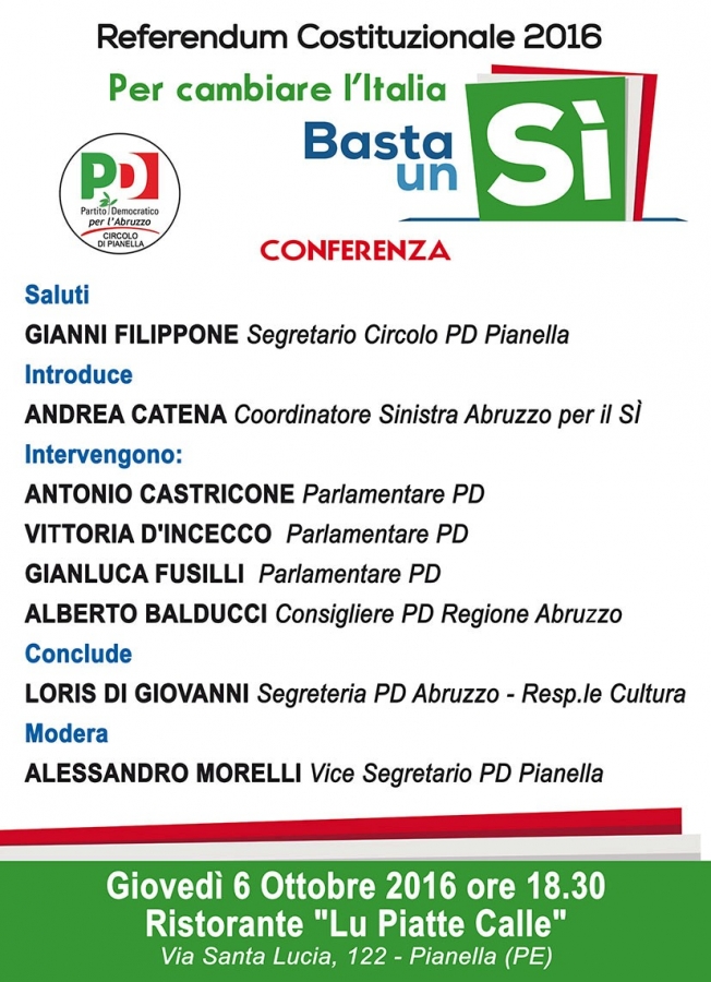 “Grazie alla presenza del coordinatore del comitato “Sinistra per il Sì”, di parlamentari e consiglieri abruzzesi del PD, sarà possibile approfondire alcuni temi della riforma costituzionale per aiutare i cittadini a comprendere meglio i contenuti. Bisogna parlare alla gente anche di crescita, di economia, di lavoro, degli investimenti fatti e delle competenze delle regioni, della lotta agli sprechi, di cultura e dei luoghi da tutelare che sono una grande ricchezza per l'Italia. Il turismo del sud può crescere grazie anche alla riforma costituzionale. Siamo tutti dalla stessa parte, siamo per una Italia più forte e stiamo andando nella giusta direzione. Vogliamo un Parlamento efficiente! Questa è una opportunità da spiegare alle persone ed i circoli possono dare un grande contributo, e, più in generale, tutti i volontari”.