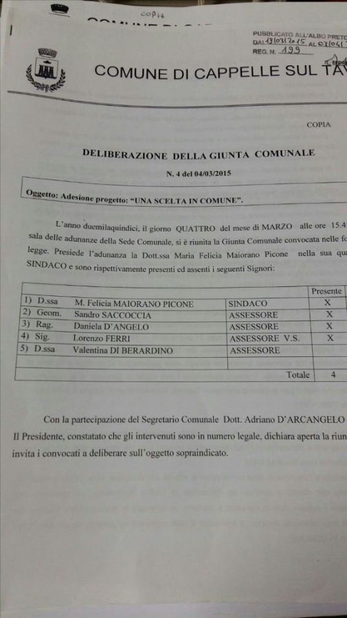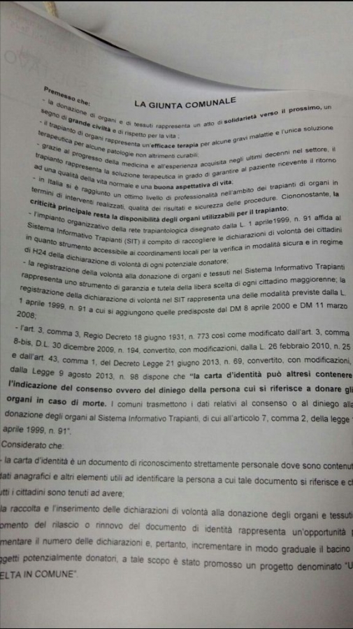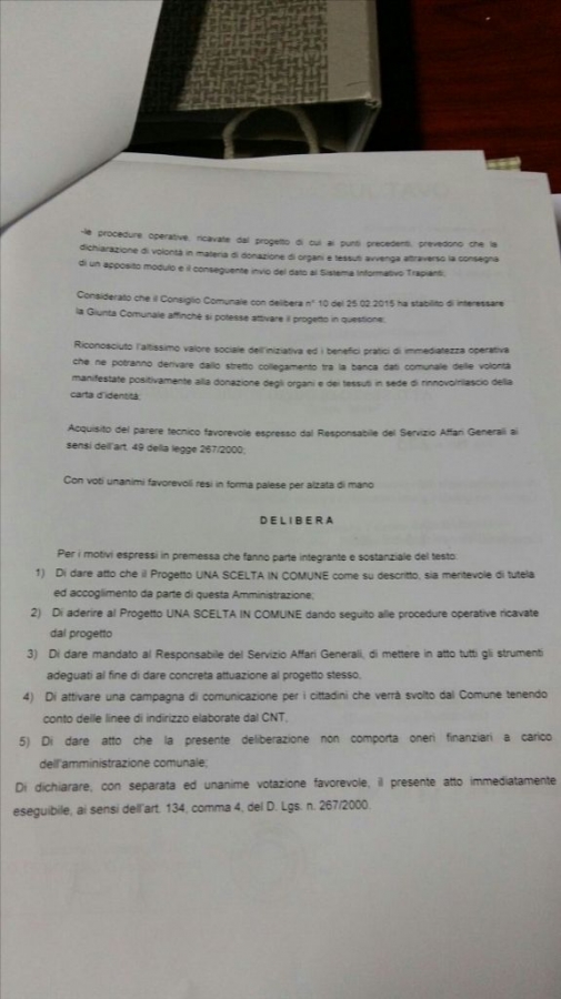 "Oh oh la memoria vacilla e fa brutti scherzi.....questa è la delibera n. 4 del 4 marzo 2015 con cui la Giunta Comunale ha adottato il progetto "una scelta in Comune" dopo averlo già approvato in Consiglio Comunale, dando mandato agli uffici competenti di espletare tutte le procedure; nel mentre il personale dell'ufficio anagrafe ha iniziato la formazione seguendo un corso specifico per l'utilizzo del software".