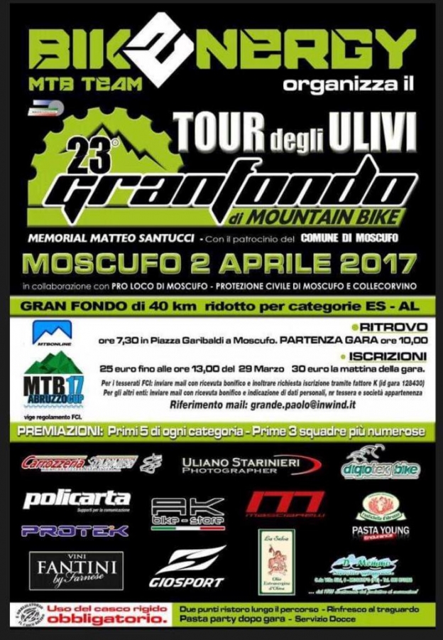 La città di Moscufo nell'entroterra collinare pescarese è orgogliosa di essere nuovamente lo scenario del Tour degli Ulivi-Memorial Matteo Santucci per continuare la tradizione di uno sport come la mountain bike che si lega alla perfezione con la promozione del territorio.