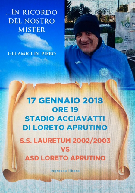 Per questo motivo, mercoledì 17 gennaio, allo stadio Acciavatti di Loreto, alle ore 19.00, si vuole ricordare e celebrare Mister Di Pietro, con una partita amichevole tra i ragazzi del ASD Loreto Aprutino, e quella che fu la squadra guidata da Di Pierto: il Lauretum 2002/2003.
