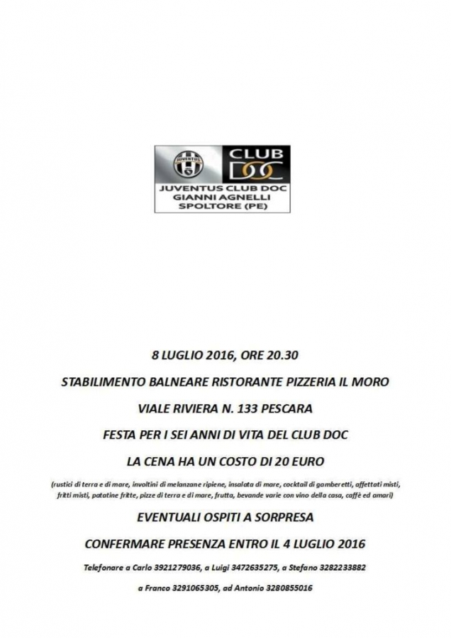L'8 luglio 2016, alle ore 20.30, presso lo stabilimento ristorante pizzeria IL MORO, si terrà la festa dei 6 anni di vita del club doc Juventus Gianni Agnelli Spoltore che raccoglie 130 soci.