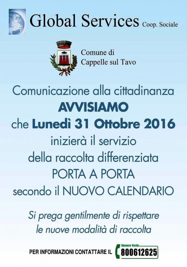 Si comunica che a partire da lunedi 31 ottobre 2016 sarà attivato il nuovo calendario del servizio di raccolta porta a porta per il comune di Cappelle sul Tavo.