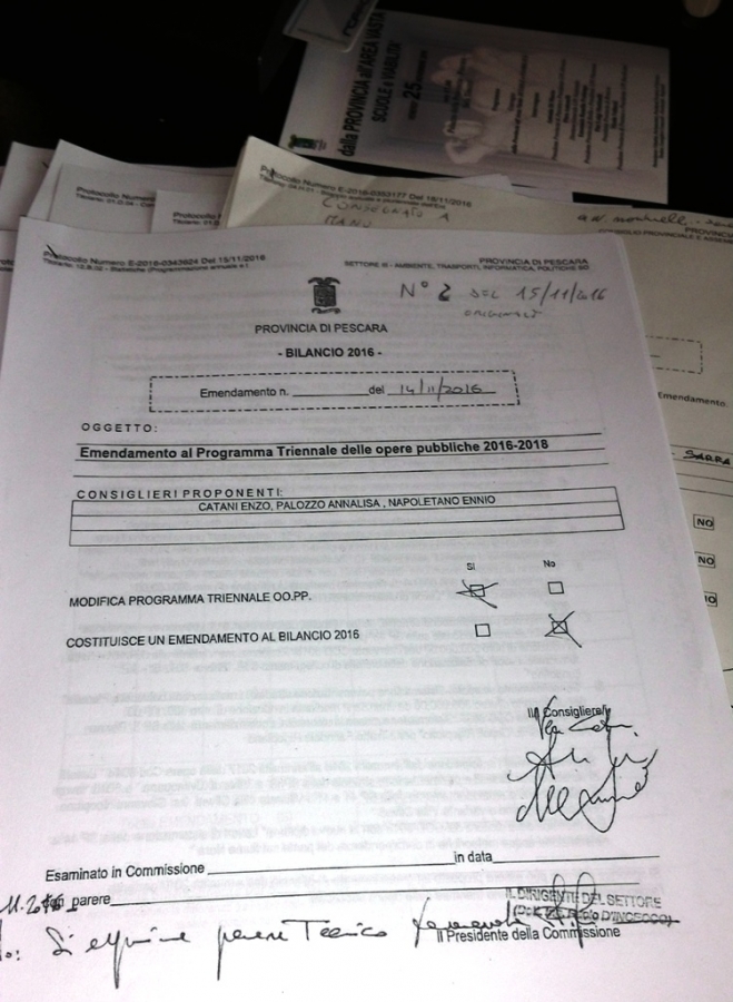 In data 3 novembre avendo preso visione del piano triennale delle opere pubbliche della Provincia di Pescara noi consiglieri Annalisa Palozzo, Ennio Napoletano e Enzo Catani abbiamo presentato un emendamento dove chiedevano l'inserimento di opere importanti rimaste escluse dal piano triennale sui territori di Turrivalignani Popoli Roccamorice Pianella e Cepagatti, comuni precedentemente esclusi dalla programmazione.