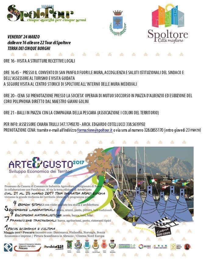 Venerdi 24 marzo dalle ore 16 alle 22, Spoltore ospiterà un evento importante organizzato dall' Amministrazione e Spoltour, in collaborazione con la CCIAA di Pescara, "Arte & Gusto".