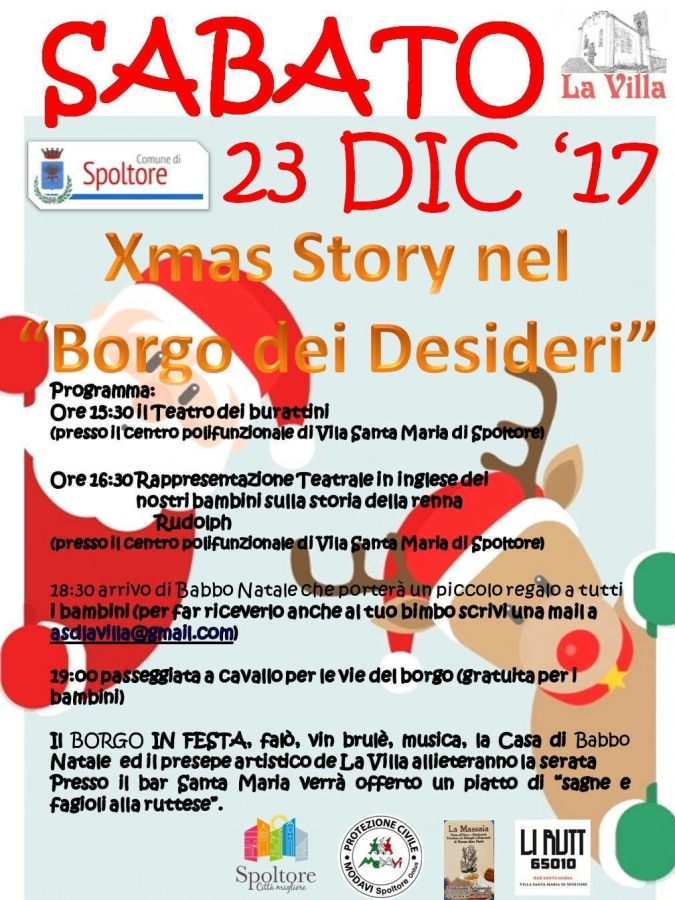 Il 23 dicembre Villa Santa Maria si trasformerà nel "Borgo dei Desideri": una giornata a tema natalizio che, dalle 15.30 in poi, alternerà una serie di eventi dedicati a grandi e piccoli. "Si tratta del primo evento natalizio specificamente pensato e dedicato al nostro borgo" precisa la consigliera Valentina Conti. Il primo appuntamento è uno spettacolo con i burattini, nell'ex asilo divenuto centro polifunzionale della frazione. A seguire, intorno alle 16.30, sempre nel centro polifunzionale, la "Storia della Renna Rudolph", uno spettacolo recitato dai bambini della frazione in lingua inglese, nell'ambito del percorso formativo "Xmas Story". Alle ore 18.00 nella piazza principale si accenderanno le luci di Natale e arriverà Babbo Natale, a bordo della sua slitta, con piccoli doni per tutti i bambini.