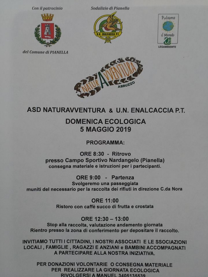 La giornata è organizzata congiuntamente da U.N. Enalcaccia P.T sodalizio di Pianella e dall’ asd NaturAvventura Abruzzo , coinvolgendo i giovani e le famiglie e gli anziani, il tutto come semplice e puro volontariato ,nessuno percepirà niente in cambio.