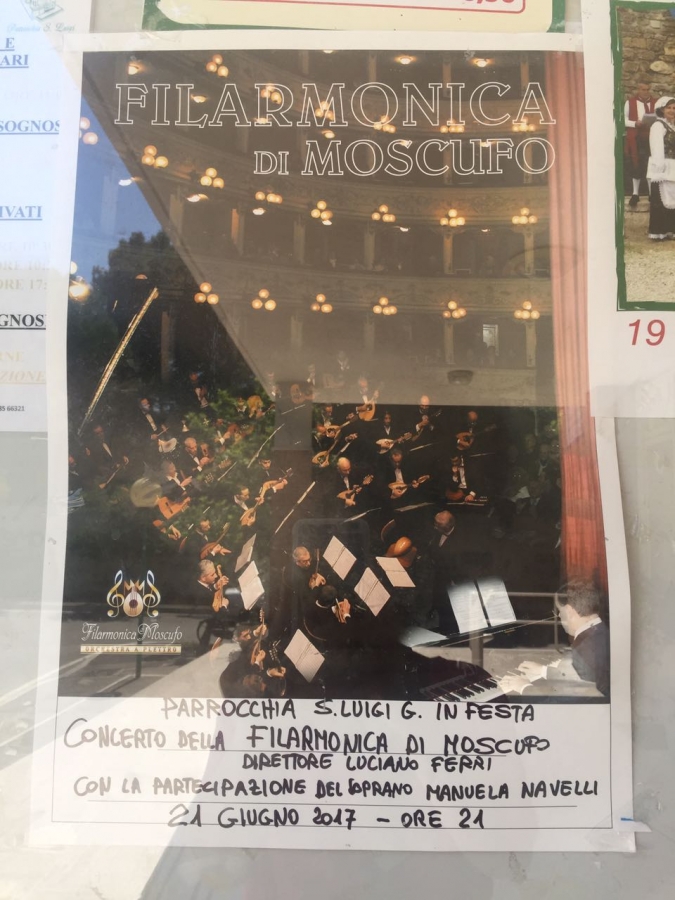 La Filarmonica di Moscufo, invece, è diretta dal maestro Luciano Ferri, con la partecipazione del soprano Manuela Navelli. L'orchestra, composta da 25 elementi, venne fondata nel 1908 da Antonio Ferri, per riempire le serate vuote di un tempo. Mandolini e chitarre sono gli strumenti principali del complesso a cui si aggiungono altri strumenti quali contrabbasso e batteria per la sezione ritmica. Integrano tale contesto strumentale il pianoforte, la fisarmonica e il clarinetto. Il reperterio spazia dalla musica sacra, a quella classica, passando al folklore abruzzese, alla musica napoletana e alla musica post moderna.